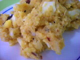 2. En un vaso de la batidora se pone el pimiento choricero frito, las cinco cucharas de aceite y un poquito de sal, triturandolo todo. Por otro lado en un bol echamos las patatas machacadas, le añadimos la cebolla picada, los huevos cocidos partidos en trozos y las aceitunas, se envuelve todo