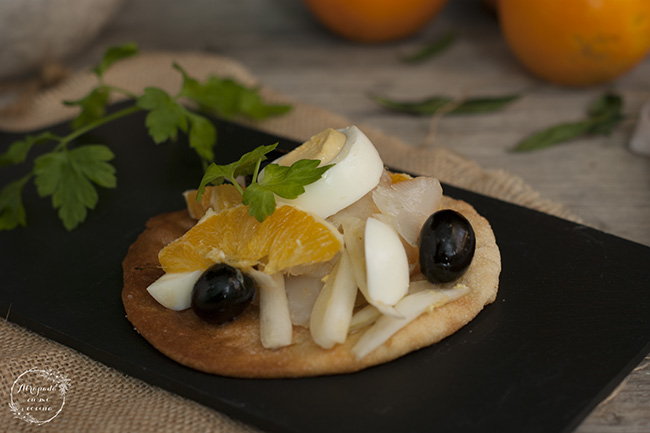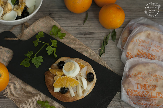 En lugar de presentarla en un plato la he querido presentar sobre una torta de aceite de Inés Rosales, concretamente de las de naranja, por eso de que el remojón también lleva naranja.