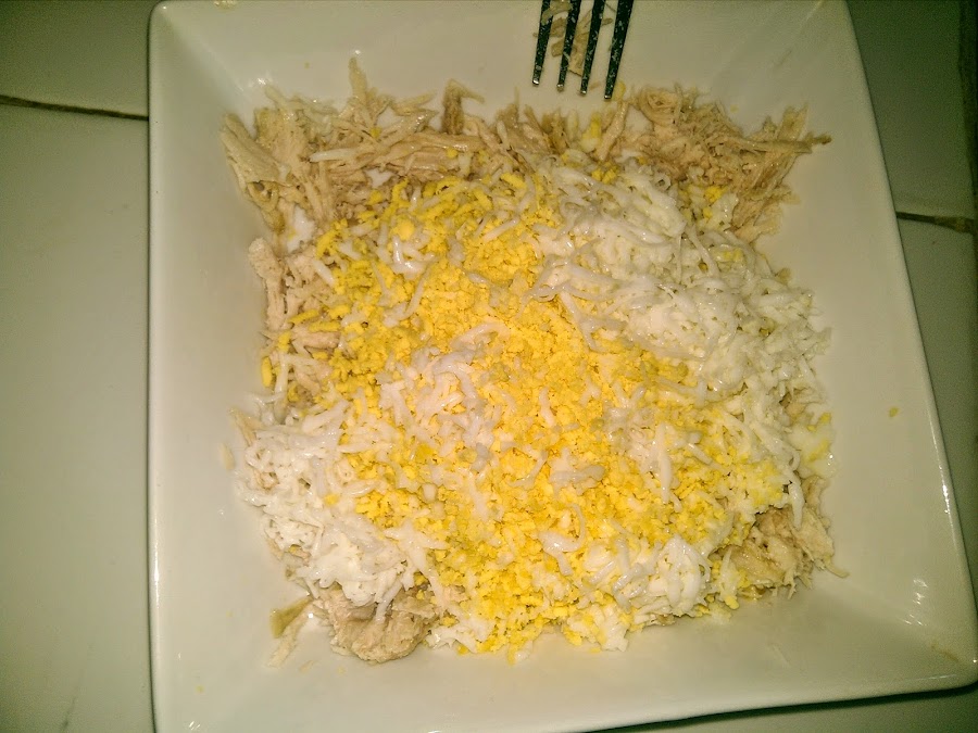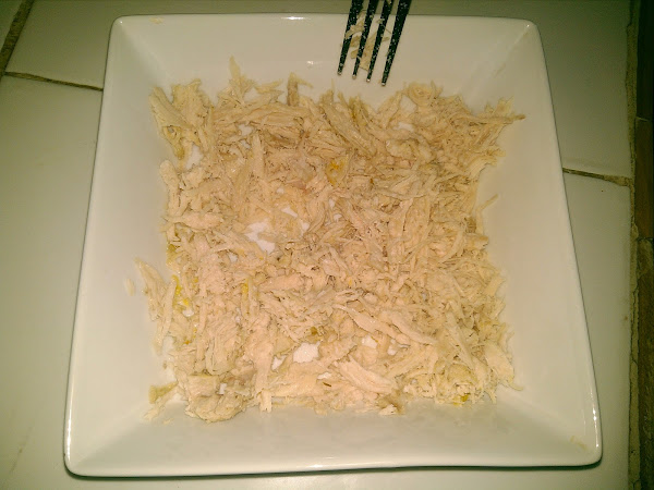 Para el relleno, deshilachamos el pollo con las manos o con ayuda de un tenedor.