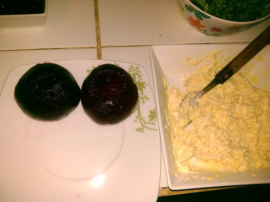 Con la pasta se rellena las beterragas, la verdad es que con un trocito pequeño de pollo y los 2 huevos salio harta pasta me podrían haber alcanzado para 3 beterragas perfectamente pero en mi casita solo somos 2 con el bebe...