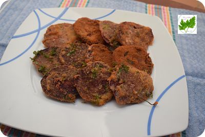 Pela las remolachas, corta en rodajas de no más de medio centímetro. Pica el perejil y mezcla con el pan rallado. Reboza las rodajas de remolacha en harina, huevo batido y el pan rallado con perejil.