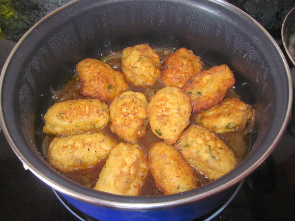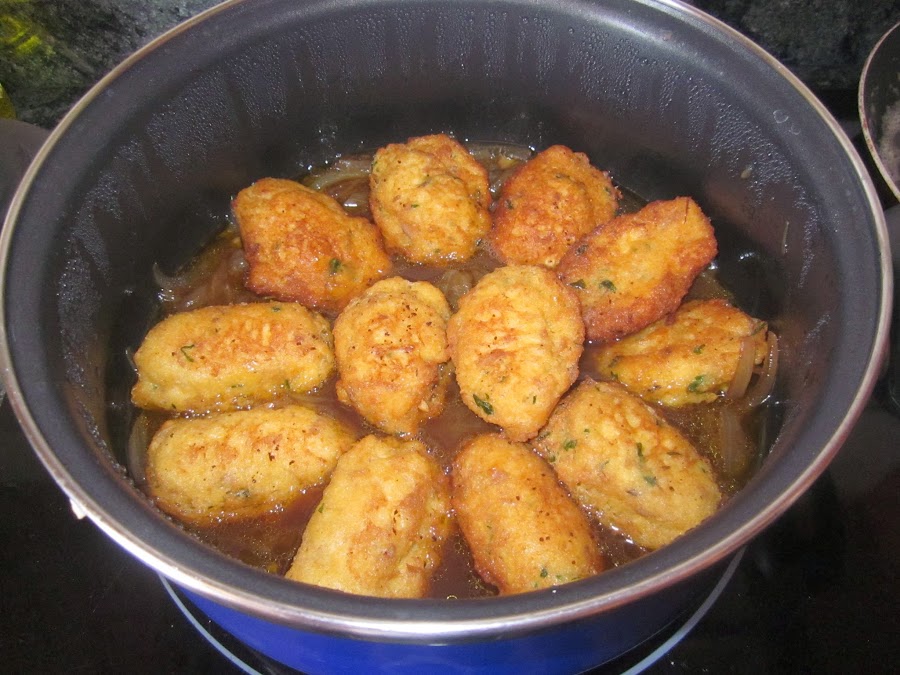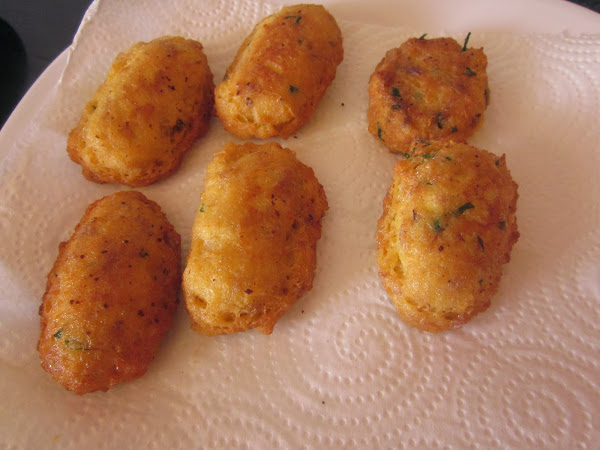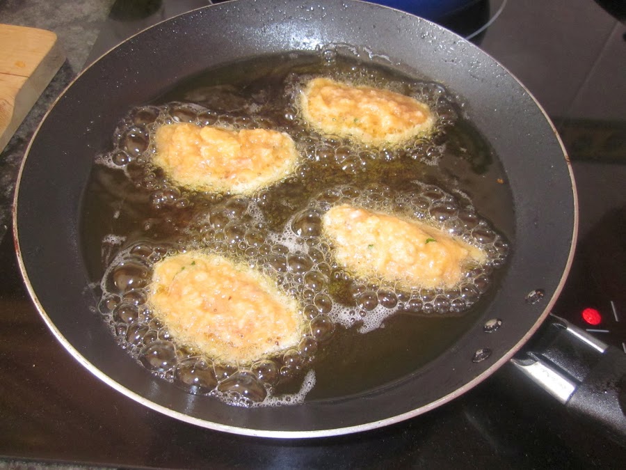 Dejamos reposar unos minutos y con una cuchara, vamos cogiendo porciones y las freímos, se pueden hacer redondas, yo las hice alargadas,tipo croquetas.