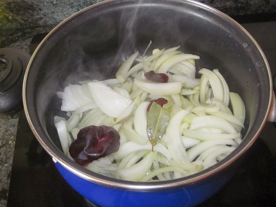 Ponemos la cebolla a pochar con aceite, a fuego muy lento,junto con la ñora,los ajos, el clavo y la pimienta, hacemos muy lento.Echamos sal.