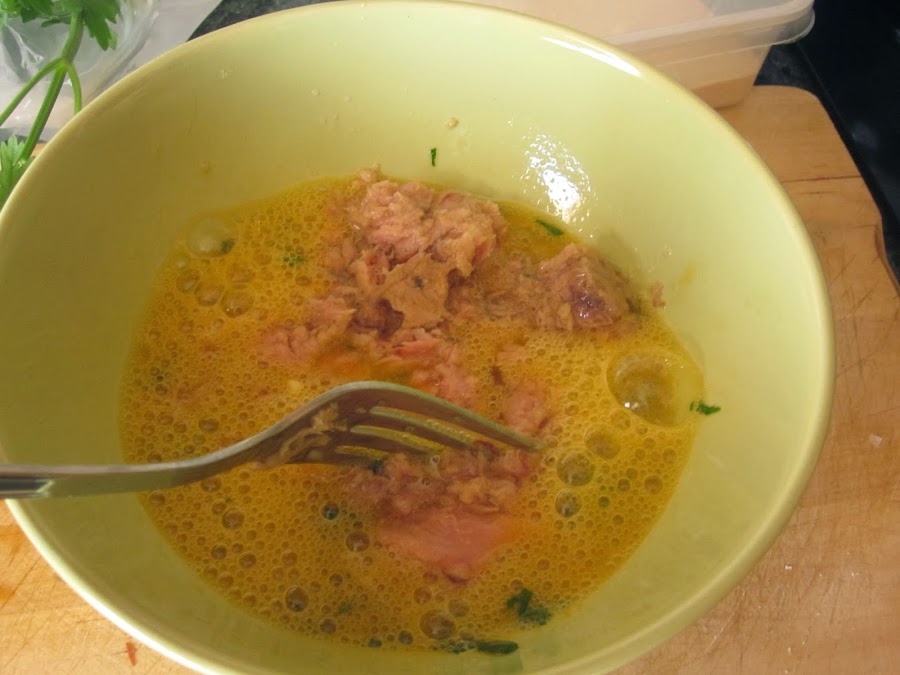 Mientras, en un bol,ponemos los huevos y añadimos el ajo y el perejil picados, añadimos el atún escurrido, la levadura, la sal, y añadimos la miga de pan,desmenuzada, con el tenedor vamos aplastando un poco para que quede compacto, si vemos que necesita mas pan,le ponemos o incluso una cucharada de pan rallado.