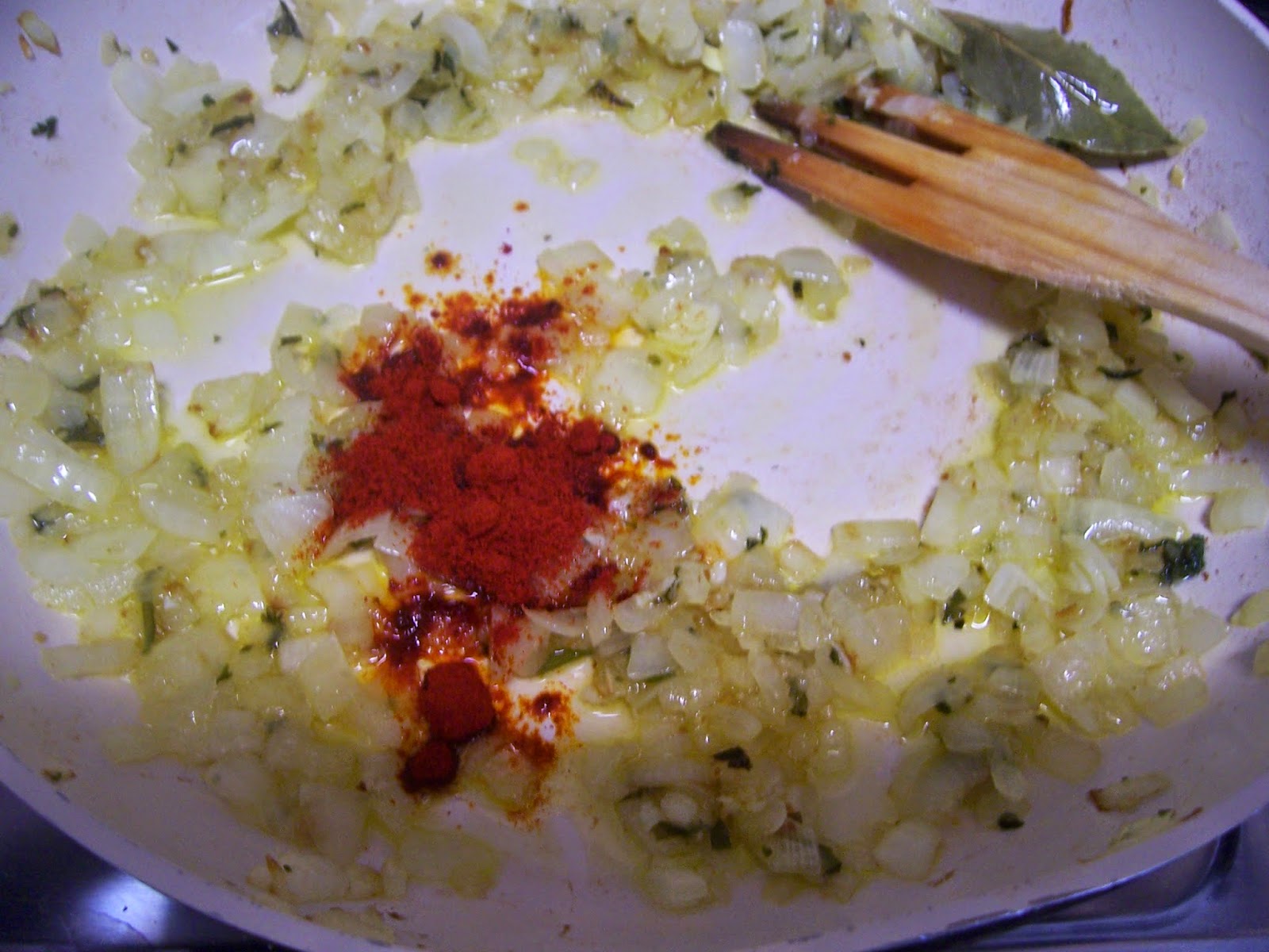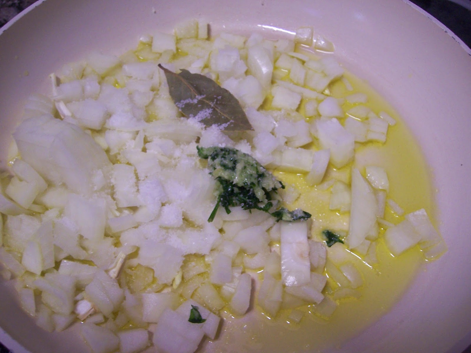 Picamos la cebolla y la ponemos a dorar en un buen chorro de aceite, laurel y la otra mitad del majado de ajo y perejil hasta que la cebolla esté transparente.