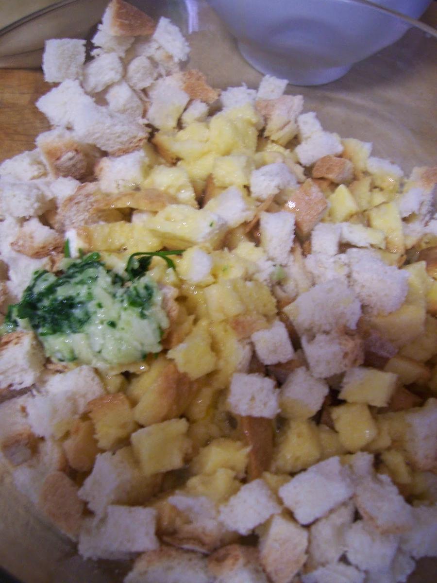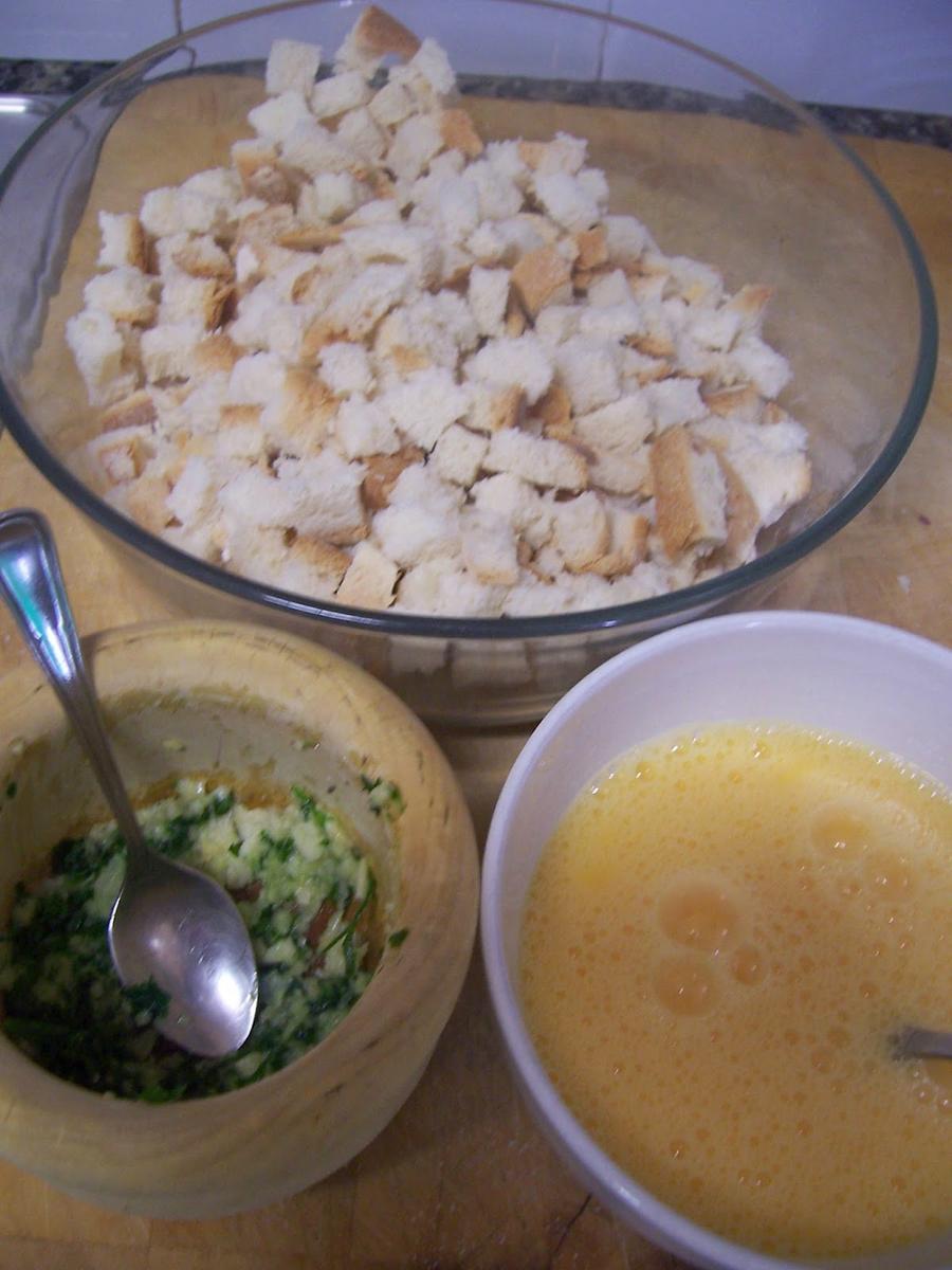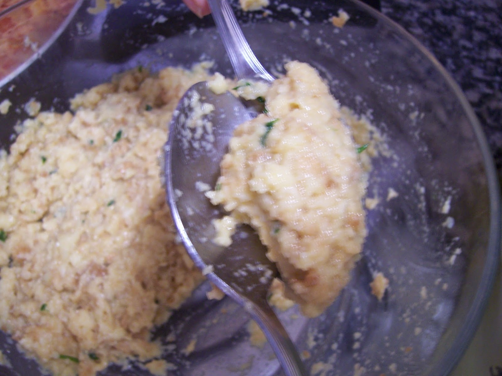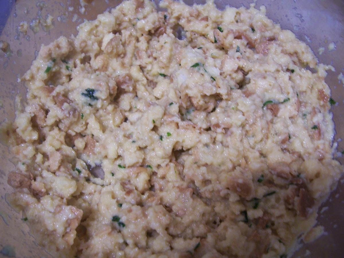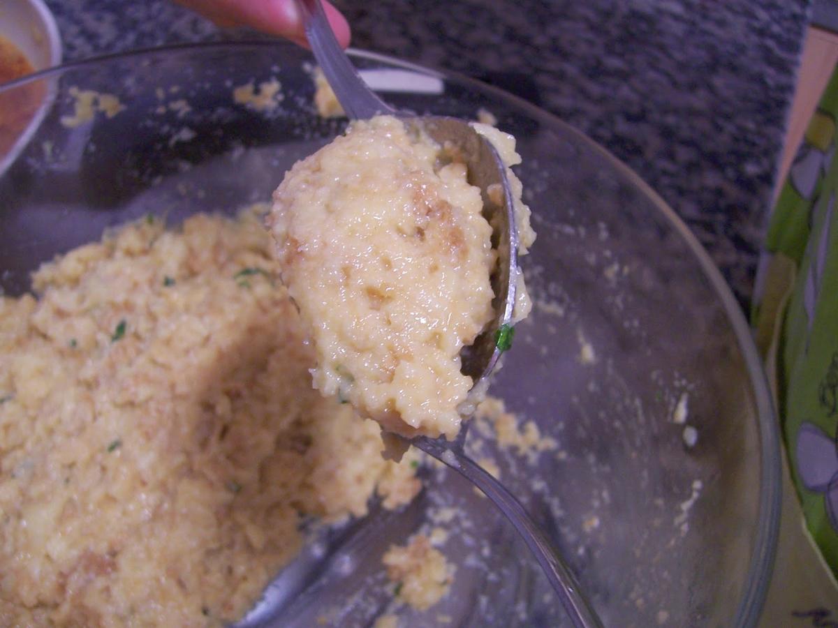 Mezclamos el pan con los huevos batidos y la mitad del majado de ajo y perejil hasta que el pan esté bien empapado de huevo pero sin quedar líquido, si es necesario añadir otro huevo, esto dependerá del tipo de pan. Dejamos reposar unos 15 minutos.