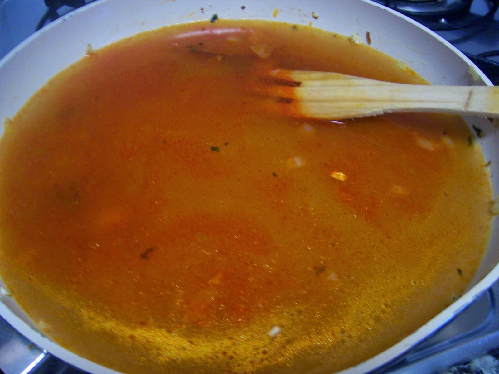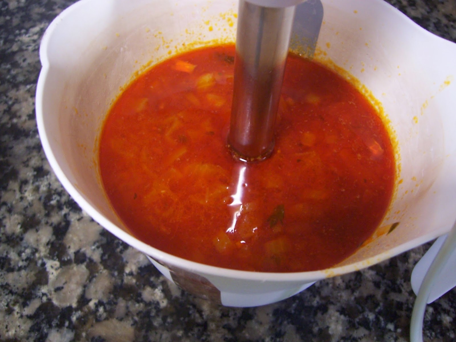 Añadimos el pimentón y rápidamente el caldo si no el pimentón amargará. Cuando rompa a hervir lo pasamos por la batidora (también se puede dejar sin triturar).