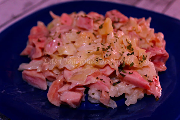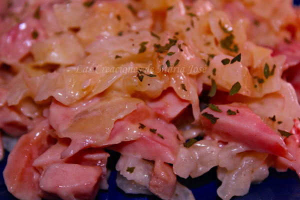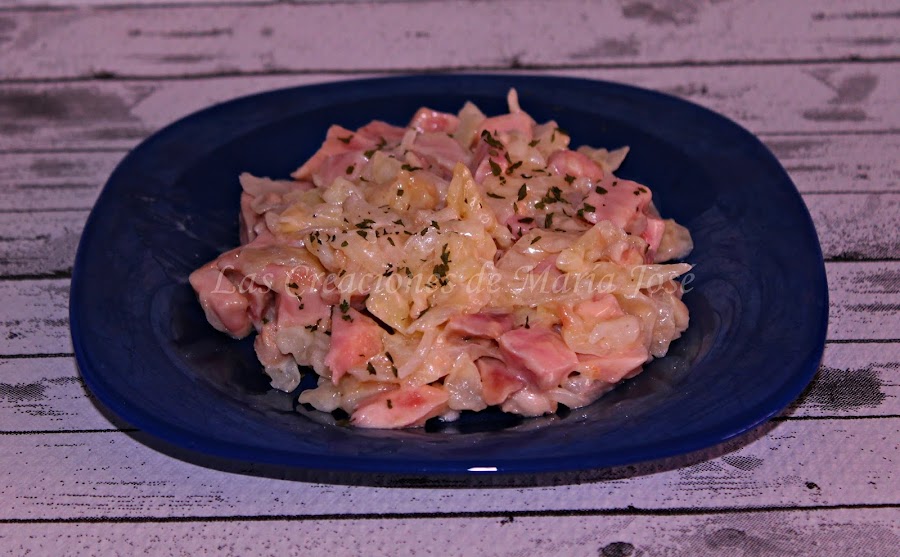 En una sartén echa la mantequilla, cuando este derretida echa el repollo y el jamón, echa un poco de sal. Rehoga todo bien.