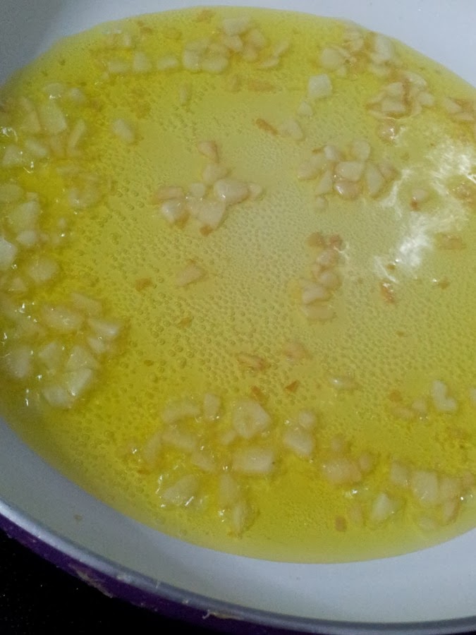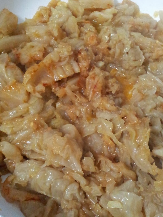 En una sartén añadimos un poco de aceite de oliva virgen extra, picamos los dos ajos y cuando estén dorados añadimos el repollo. Rehogar durante unos segundos y añadimos media cucharada de pimentón. Mi madre lo hace de esta manera para que el pimentón se mezcle con el repollo, en vez de echarlo antes.