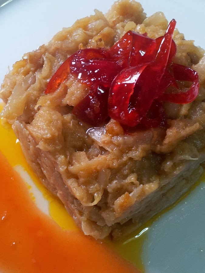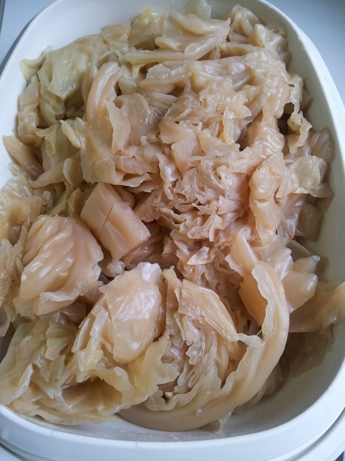 En un molde rectangular vamos rellenando con el repollo, añadimos la salsa agridulce, que podemos encontrar en cualquier supermercado y el resultado es un plato sencillo con un sabor muy agradable, me encanto prepararlo de esta nueva manera, quedo delicioso. Ayyyy como le diga a mi madre que le cambie la receta, seguro que me la pide.