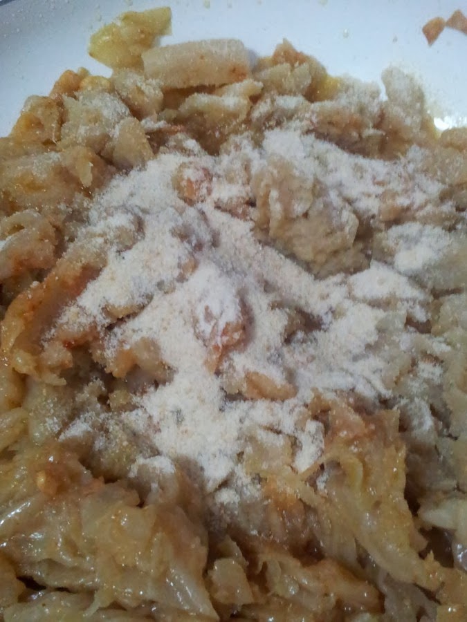Una vez que está todo mezclado, añadimos las dos cucharadas de pan rayado, sofreímos un poco junto con el repollo durante unos 5 minutos cuando veamos que el pan este bien integrado y tostadillo junto con el repollo.