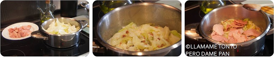 Incorporamos el repollo, como queremos cocinarlo en su jugo, no le añadiremos agua ni ningún otro líquido.