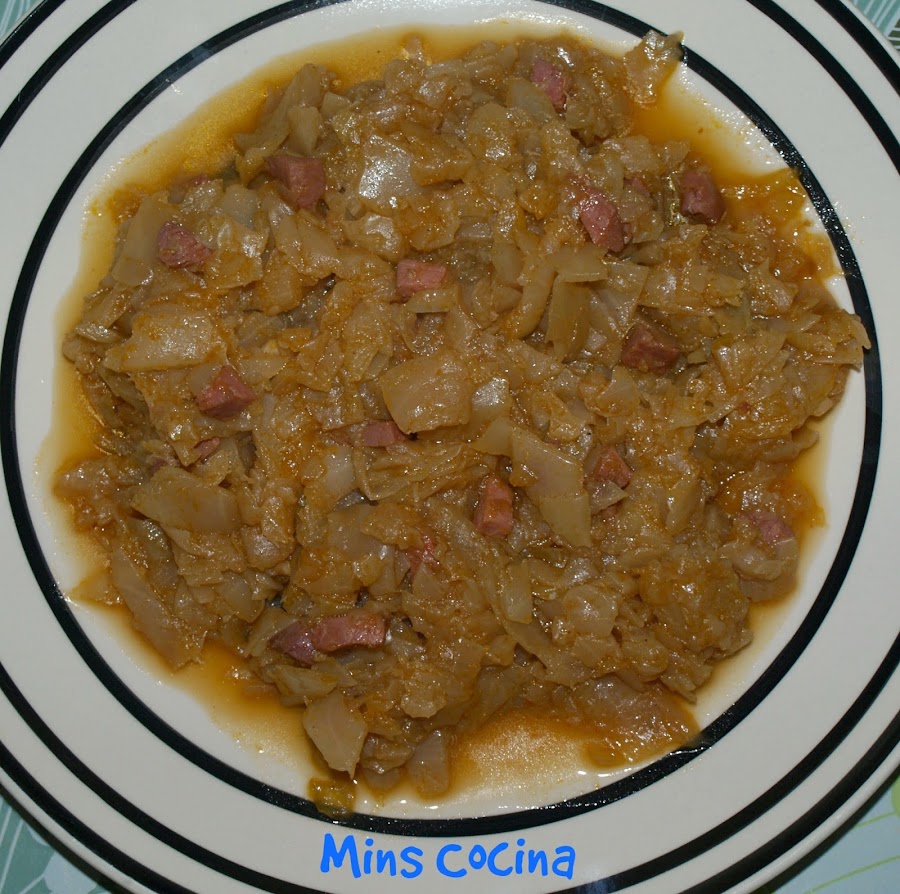 El plato de hoy es de esos típicos, de toda la vida, de los que que hacían las abuelas y las madres, que alimentan, cunden y están buenísimos: verduras guisadas. En este caso repollo. Aproveché que aún me quedaba un trozo de jamón que me había enviado mi madre en uno de sus maravillosos paquetes de sabor español, y me dije que tenía que hacer algo rico, rico. Como tenía el repollo... pues repollo guisado con jamóncito. Ummm! Y sí, quedó totalmente de ummm! o de ñam, ñam! :) Delicioso!
