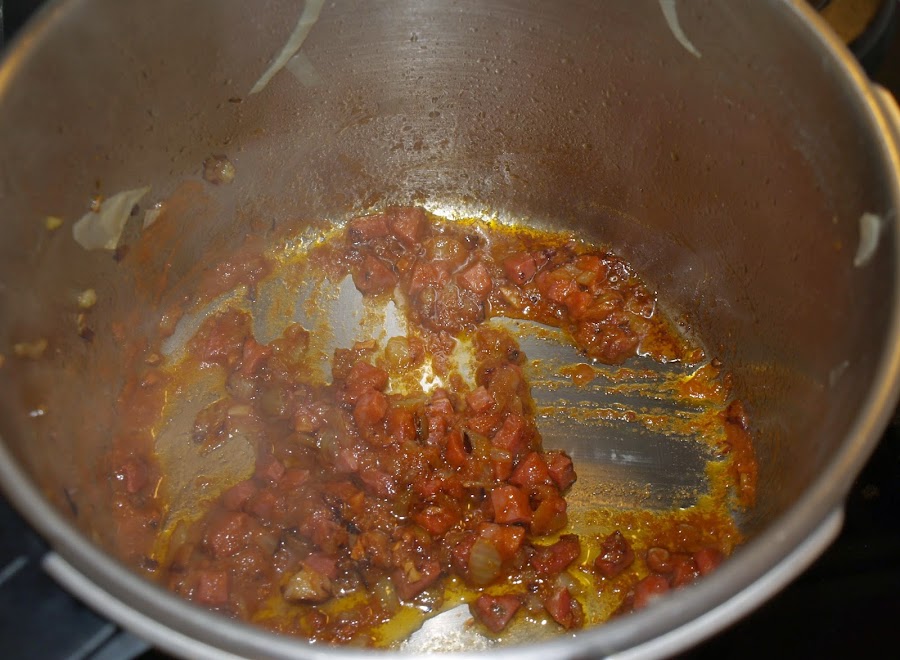 - Por último ponemos el tomate y el pimentón ( y la pastilla de caldo si decidimos ponerla. Yo no lo hice, y la verdad es que no hace falta. Hay sabor de sobre, pero como queráis) y sofreímos unos minutos.