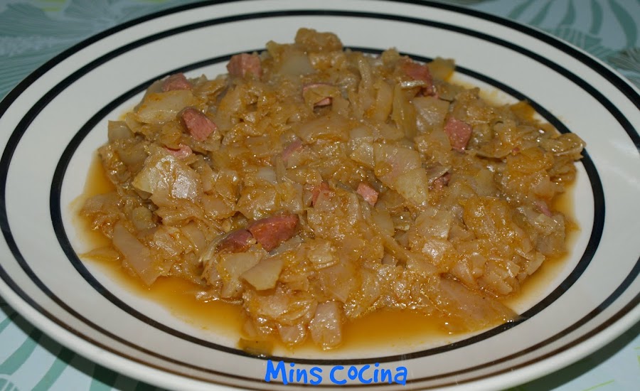 - Cuando el sofrito esté listo, añadimos el repollo y agua, puede ser la que utilizamos previamente en la cocción (al gusto, según lo queramos de caldoso), removemos bien y dejamos guisar unos 10 minutos. Removemos de vez en cuando.