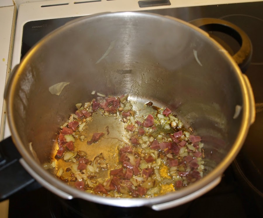 - En una sartén ponemos a calentar un poco de aceite y doramos la cebolla y el ajo previamente picados.