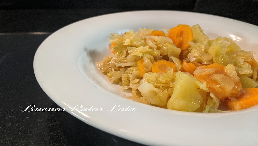 Una col no tiene por qué resultar aburrida; usando especias la convertirás en un rico y saludable plato. Hoy, además de la col, he añadido patatas y zanahorias en pequeños trozos. Cómo especias: curry rojo que tiene un toque picante muy agradable pero puedes usar otras: pimentón de la Vera, una cayena, cúrcuma... hay muchas posibilidades. Vamos con la receta: