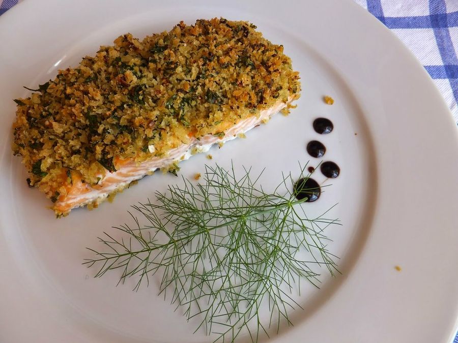 A no ser que nos hayamos pasado con el salmón ahumado en los entrantes, podemos optar por servir salmón como plato principal. Una opción sencilla para sorprender a tus invitados es esta receta del blog El Restaurante del Fin del Mundo en el que se crea sobre el lomo de salmón una costra con panko, especias y un poco de mostaza.