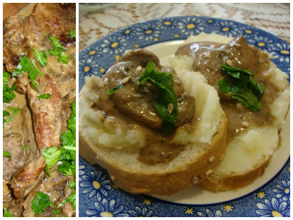 A mi me gusta preparar unos pequeños bocadillos, sólo le unto puré de papa a una rebanada de pan y lo baño con un poco de la deliciosa salsa de la carne, y por qué no, uno que otro champiñón... y el toque de frescura, el perejil... delicioso!!