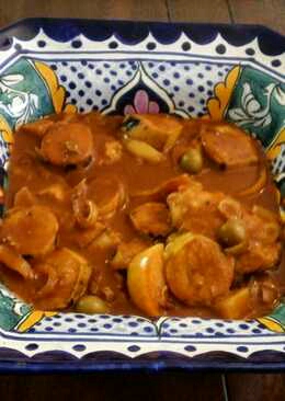 Colocar a los trocitos de carne la salsa inglesa,mostaza y pimienta,calentar una olla alta con el aceite colocar los trocitos de carne poco a poco hasta comenzar a dorar luego colocar cebolla,chile dulce y ajo triturado cocinar a cristalizar ya listo colocamos el tomate pelado y picado cocinar 5min más,ahora colocar el agua,sal,orégano,tomillo,laurel y papas bajar el calor a medio cocinar hasta suavizar la carne y papas,ya listo agregar la salsa de tomate,pasta de tomate revolver dejar hervir,agregar el azúcar y vino blanco dejar hervir retirar el tomillo y laurel colocar las aceitunas mezclar dejar de nuevo hervir y listo para servir.