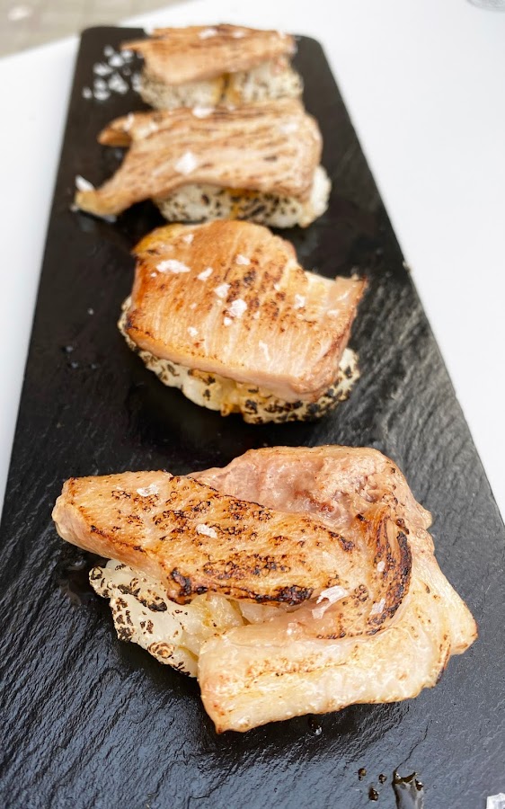 El segundo entrante que pedimos fueron los niguiris de papada ibérica que terminan de cocinar en la mesa con un soplete. Lleva la bolita de arroz, un poquito de trufa negra y encima la papada ibérica. Una vez cocinado con el soplete, te recomiendan espolvorear la sal por encima. Es simplemente espectacular, fue el plato que más nos gustó, sin duda lo tenéis que pedir si vais, ya que es un bocado que se deshace en la boca. Un imprescindible de este local.
