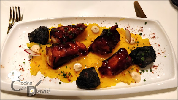 Continuamos con los segundos, para empezar la causa de pulpo. Causa peruana con base de patata, pulpo glaseado muy sabroso, lágrimas de alioli de chipotle suave y picantito y yuca en forma de carbones. Un plato muy bonito, y muy rico.