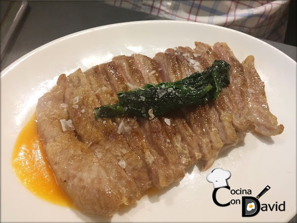 Y por último, y no menos bueno, el "Secreto de Bellota 100% Ibérico, calabaza y espinacas". Toda una delicia de secreto, con su dorado, cada bocado se deshacía en tu boca, con una base de crema de calabaza, y coronado con espinacas y sal en escamas. Un acierto, si lo que te gusta es el cerdo ibérico.