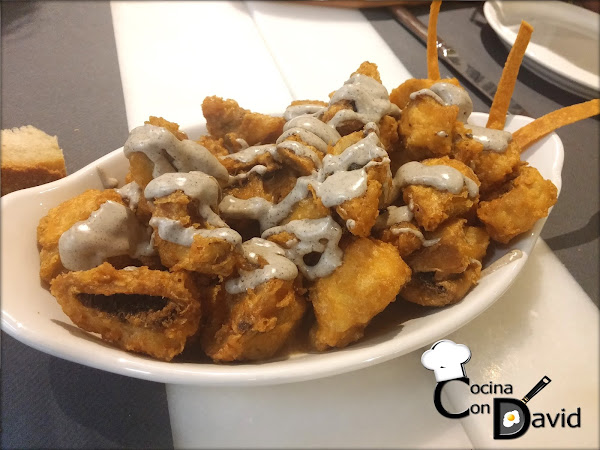 Seguimos con los "Champiñones en tempura con mahonesa de trufa". Con una fina tempura ligera y crujiente, nos encontramos con unos champiñones con mucho sabor, y cremosos. Corona esta fritura, una mahonesa de trufa suave, que acompaña perfectamente a estos bocados.