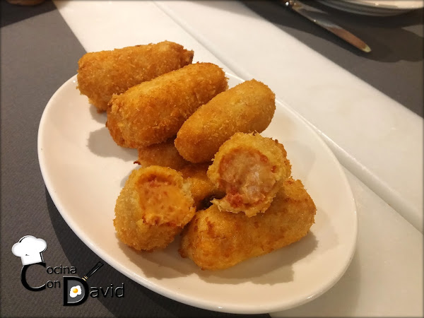 Comenzamos probando las "Croquetas de chorizo de Pamplona", caseras, suaves y cremosas. Tienen un rebozado crujiente, el interior se deshace en tu boca, con un suave sabor a chorizo, nada fuerte, y muy agradable. Es lo que suelo decir, si las croquetas de un restaurante están buenas, el resto tiene que estarlo, porque tanto como para unas croquetas, como para una tortilla de patata, hay que ponerle mimo y cariño. Recomendables.