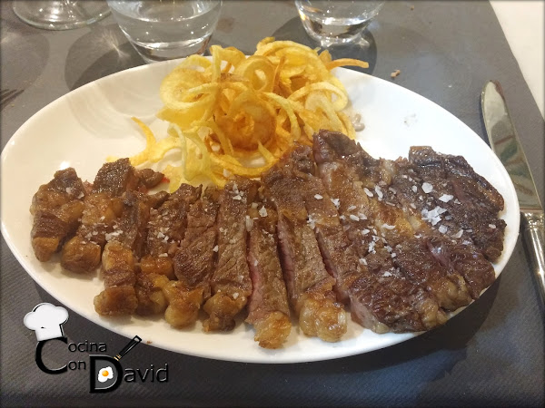 De segundo pedimos, en uno de los casos, el "Entrecotte con hilos de patata trufada". Un sabor intenso a carne, con el punto justo de cocción y muy buena. El único pero del plato, los hilos de patata trufada, que no estaban recién hechos, y no estaban crujientes. Una pena, porque recién hechos tienen que estar de vicio.