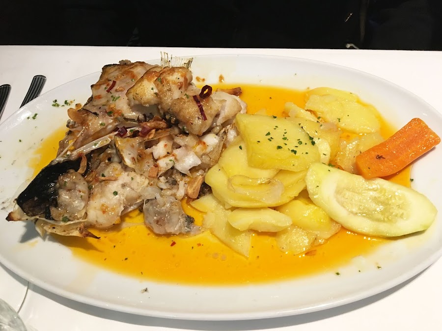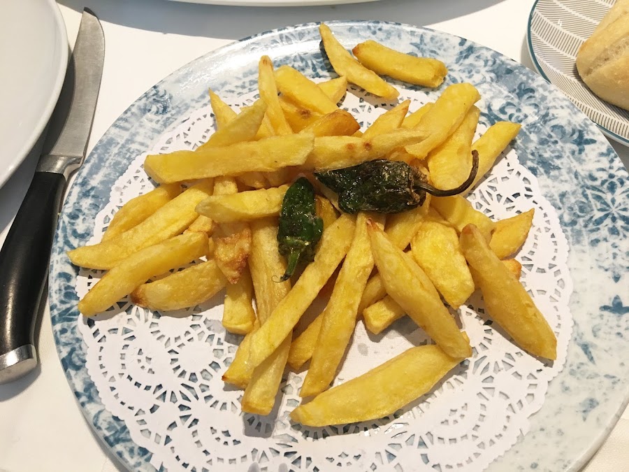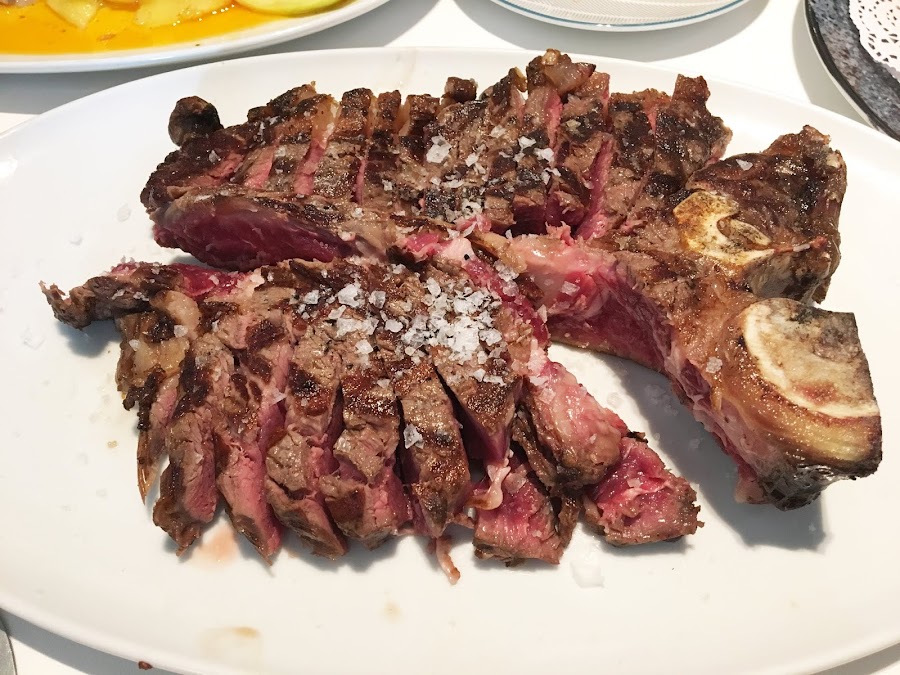 Como plato principal pedimos cogote de merluza con salsa bilbaína, con un sabor muy suave y acompañado de patatas panaderas, buñuelitos de bacalao en tempura con miel de caña, buenísimos también, merece la pena pedirlos sin duda. Por último, pedimos también un T-bone a la brasa, que estaba fuera de carta pero nos lo ofrecieron al principio, es para 2 personas, viene acompañado de patatas y pimientos verdes y, si os gusta la carne, tenéis que pedíroslo porque es increíble lo tierna que está la carne y al cocinarse a la brasa tiene un sabor espectacular, ¡volvería sólo para comerlo de nuevo!