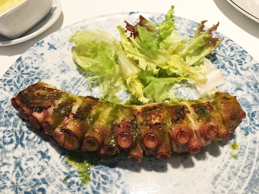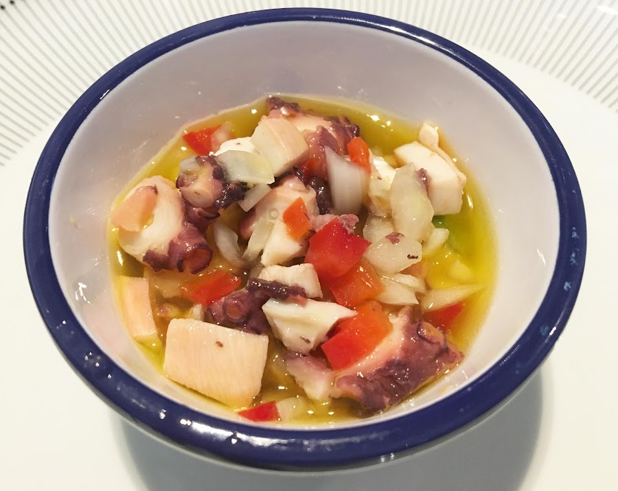 Nada más sentarnos, nos sirvieron las bebidas, unas aceitunas y un cuenco individual de pulpo a la vinagreta para cada comensal. El pulpo nos gustó mucho, y de hecho también lo pedimos a la brasa como ración, ya que es uno de sus platos más famosos.