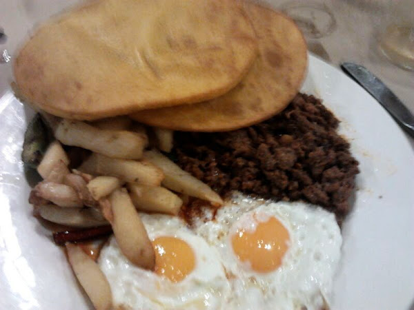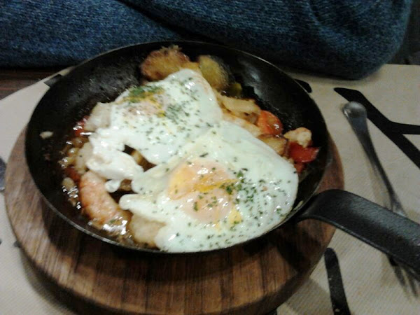 Pero por si esto fuera poco, seguimos... con una sartén con una sartén de bacalao, langostinos y huevos fritos. Y un plato de picadillo con tortas de maíz. Sin duda, una cena muy contundente.
