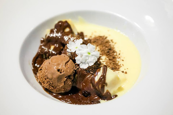 - Coca de llanda con chocolate caliente y helado de merengada. De las mejores cocas de llanda que hemos probado nunca. Y mirad que somos los locos de la coca de llanda y cada semana acaba cayendo una casera o de alguna panadería. Así que íbamos con mucho espíritu crítico jajajaja Y no decepcionó. Jugosa, con un sabor sutil a cítricos, textura esponjosa y con la combinación del chocolate caliente y el helado... ¡Una delicia/