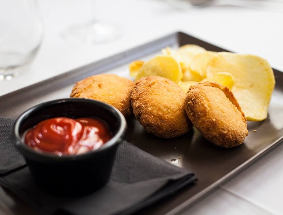 - Nuggets de pollo... ¡Caseros! En alguna reseña web leímos que eran congelados... ¡¿En serio?! Si eran congelados estaban logradísimos, de verdad. La carne era pollo y el empanado parecía de verdad y super crujiente. Los niños se pidieron de entrante los nuggets que nos recomendó para ellos la camarera Raquel (un encanto de profesional) y fue acierto de pleno.