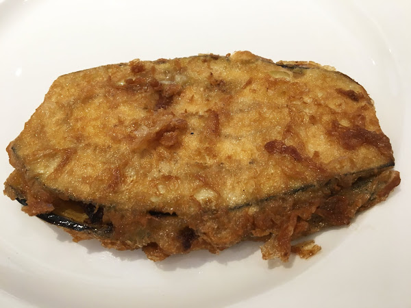 Por último, pedimos un tercer entrante que fueron berenjenas rebozadas rellenas de plátano. Éste fue sin duda el entrante más original de todos, pronto lo prepararemos en el blog para que podáis tener la receta en el blog, ¡seguro que os encanta tanto como a nosotros!