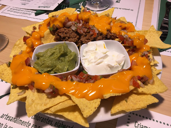 Para comenzar, pedimos una ración de nachos caseros, con queso cheddar, carne y pico de gallo, acompañada de guacamole y queso agrio. La ración es bastante grande y estaba muy rica, el guacamole era casero y la combinación del queso cheddar con el pico de gallo y la carne nos gustó mucho.