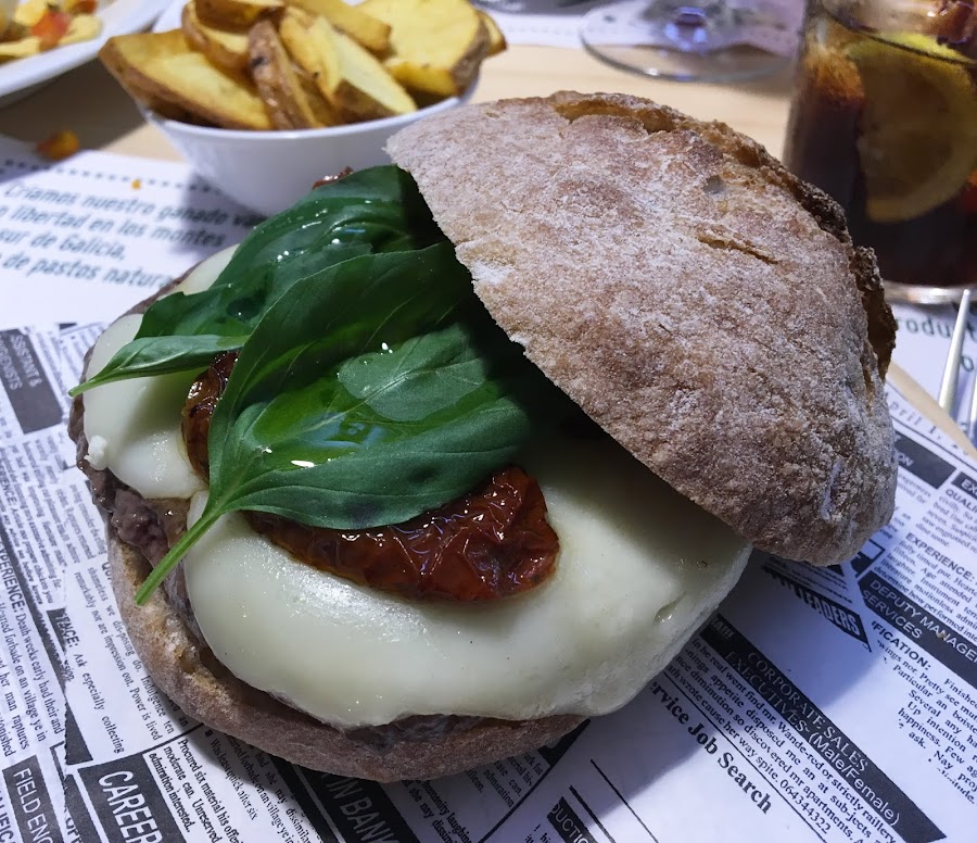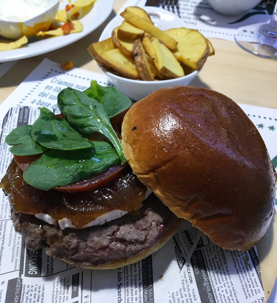 Después, pedimos hamburguesas, ya que son el plato estrella del restaurante, elaboradas 100% con carne de vacuno gallego y con menos del 5% de materia grasa, ¡riquísimas! La primera que probamos fue la Cachiquimbra, con queso de cabra, cebolla caramelizada, tomate, espinacas frescas y aceite de oliva.