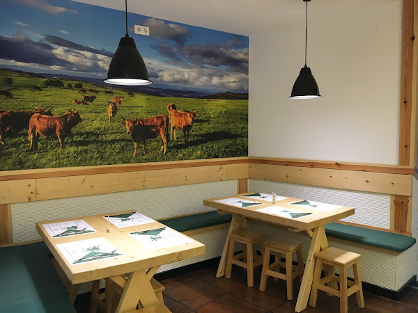 Todo el local está ambientado tonos verdes, que recuerdan a las extensas praderas gallegas, y decorado con fotografías de los animales que crían allí y que con tanto cariño cuidan.