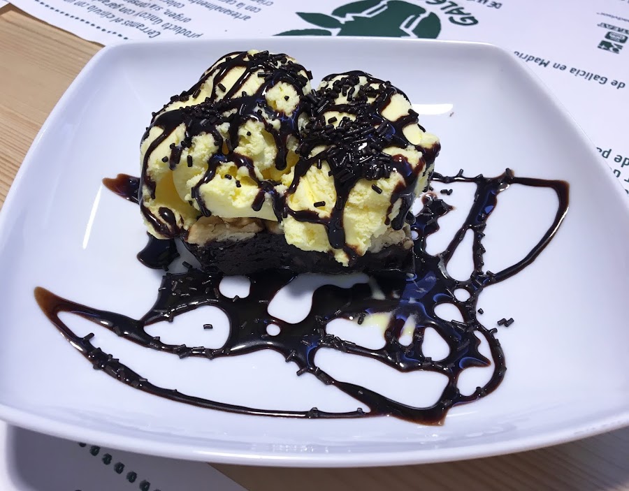 De postre, pedimos un brownie para compartir, acompañado de helado de vainilla, muy jugoso y más ligero que el de otros locales.