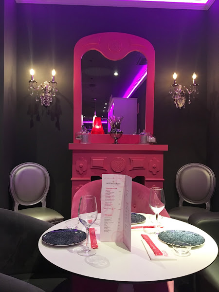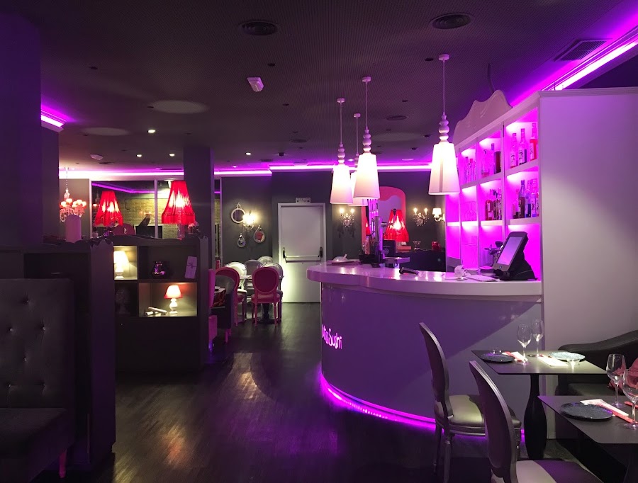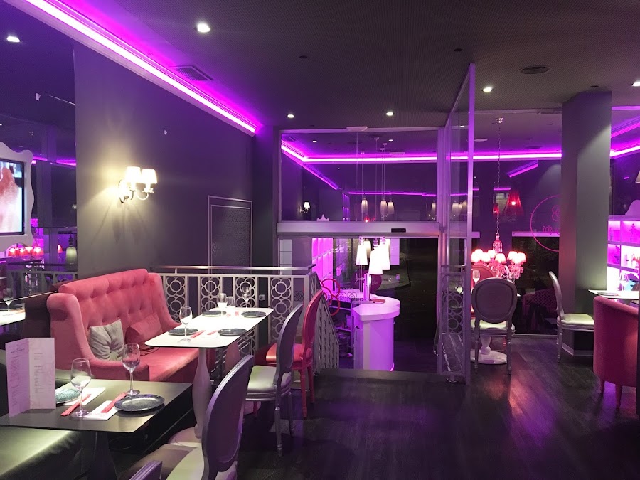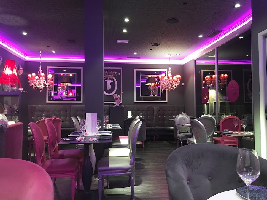 El local está decorado en tonos rosas, morados y grises, muy femenino y bonito, con sillas de diferentes tipos y colores y una luz tenue y agradable.