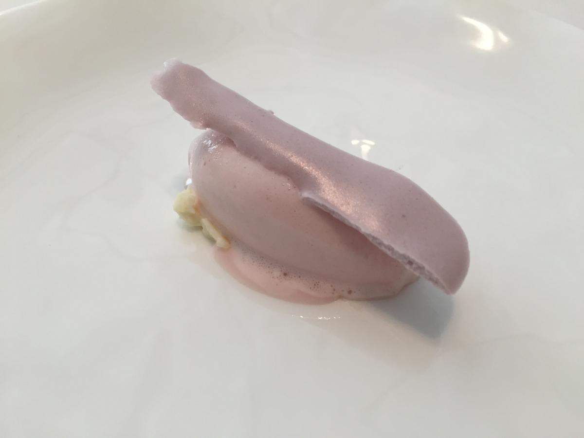 Caseína de leche batida, helado de fresas y crujiente de violeta