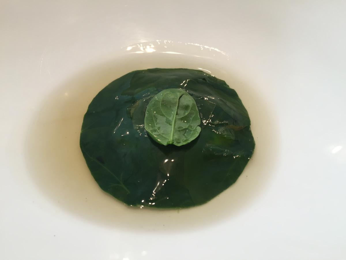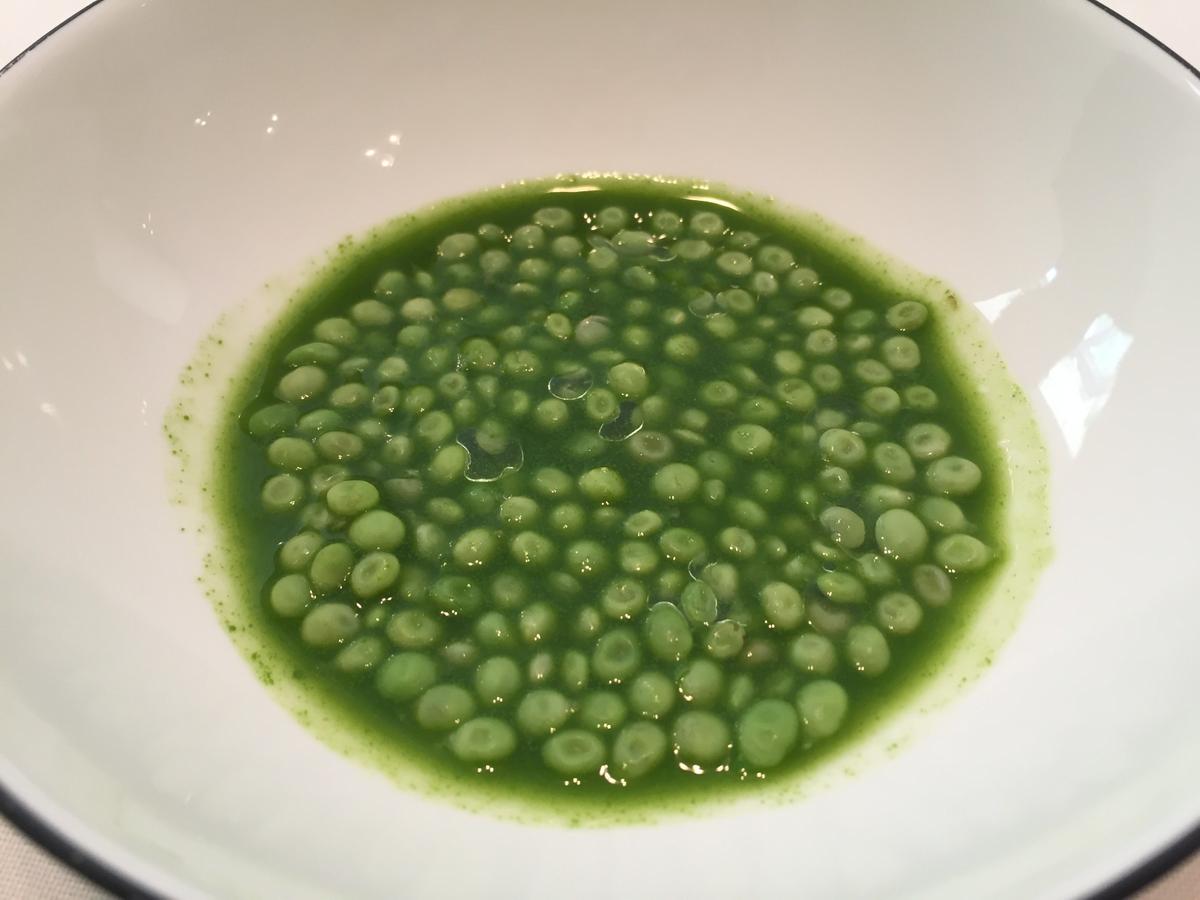 Guisante lágrima, jugo de acelga y guindilla: el jugo de acelga poco destacado frente al picante de la guindilla.