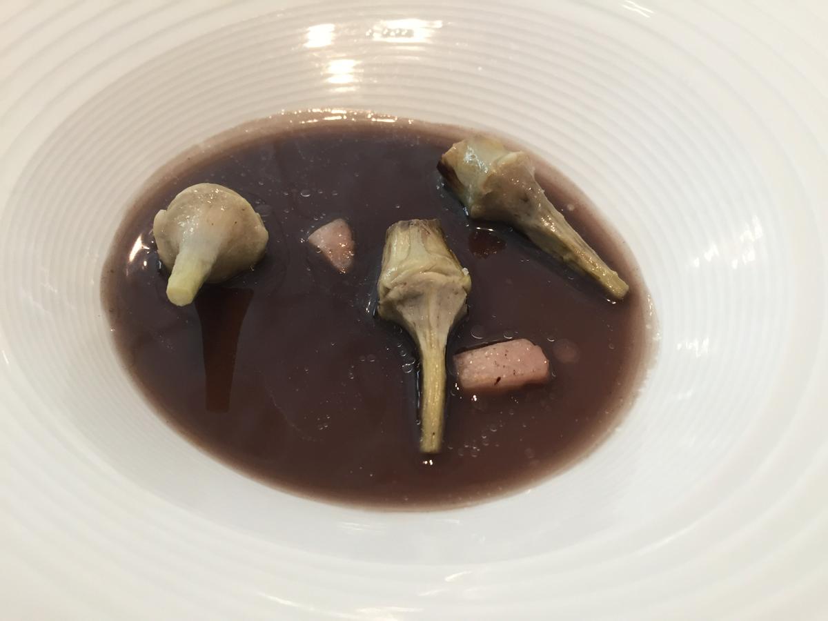 Alcachofas, tuétano, sopa de lentejas y champiñones: suculencia máxima de las alcachofas con el tuétano.