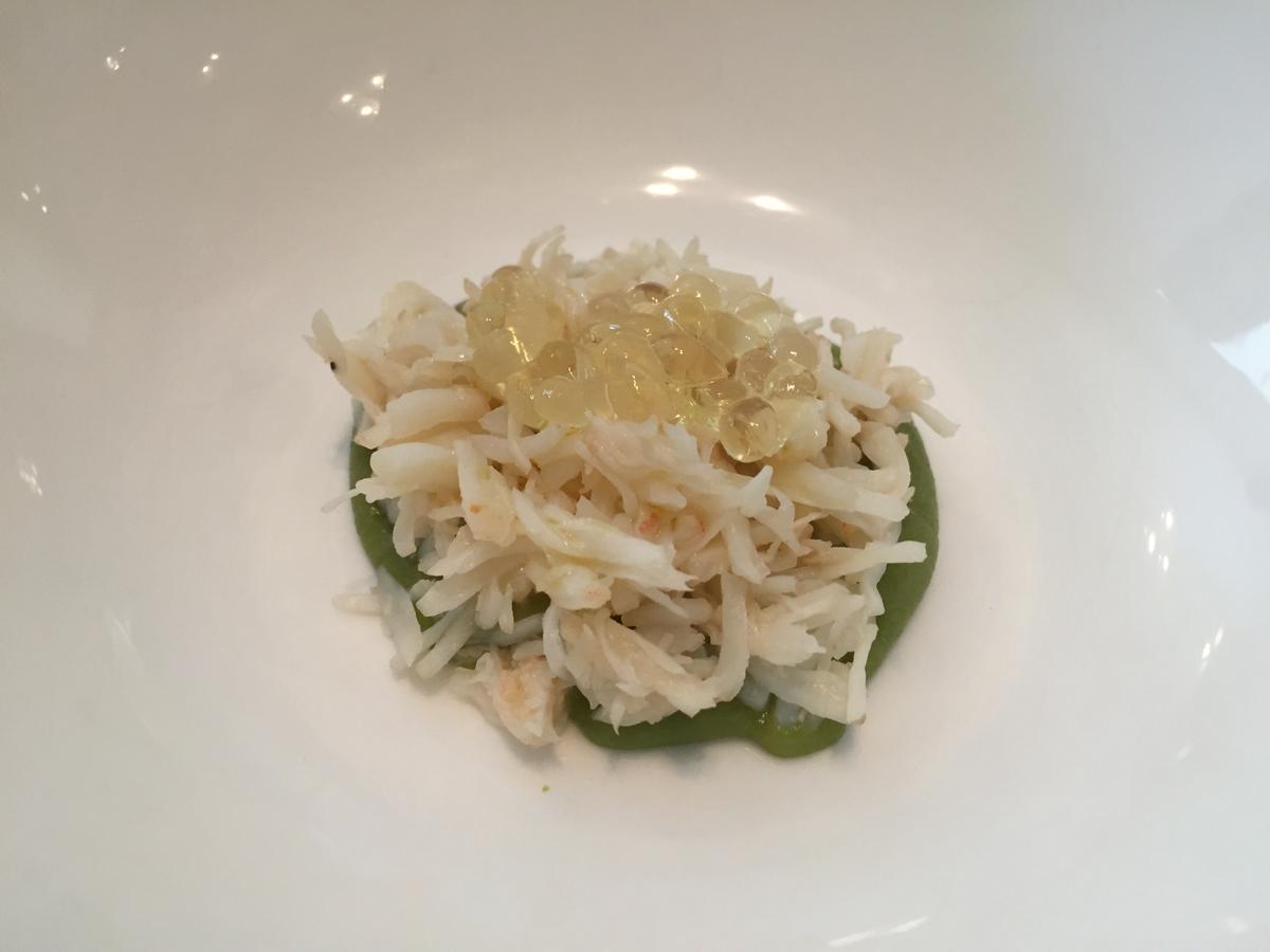 Txangurro, guisantes y aguacate: las perlas están hechas con el propio caldo del txangurro. Buena combinación con la crema de aguacate.