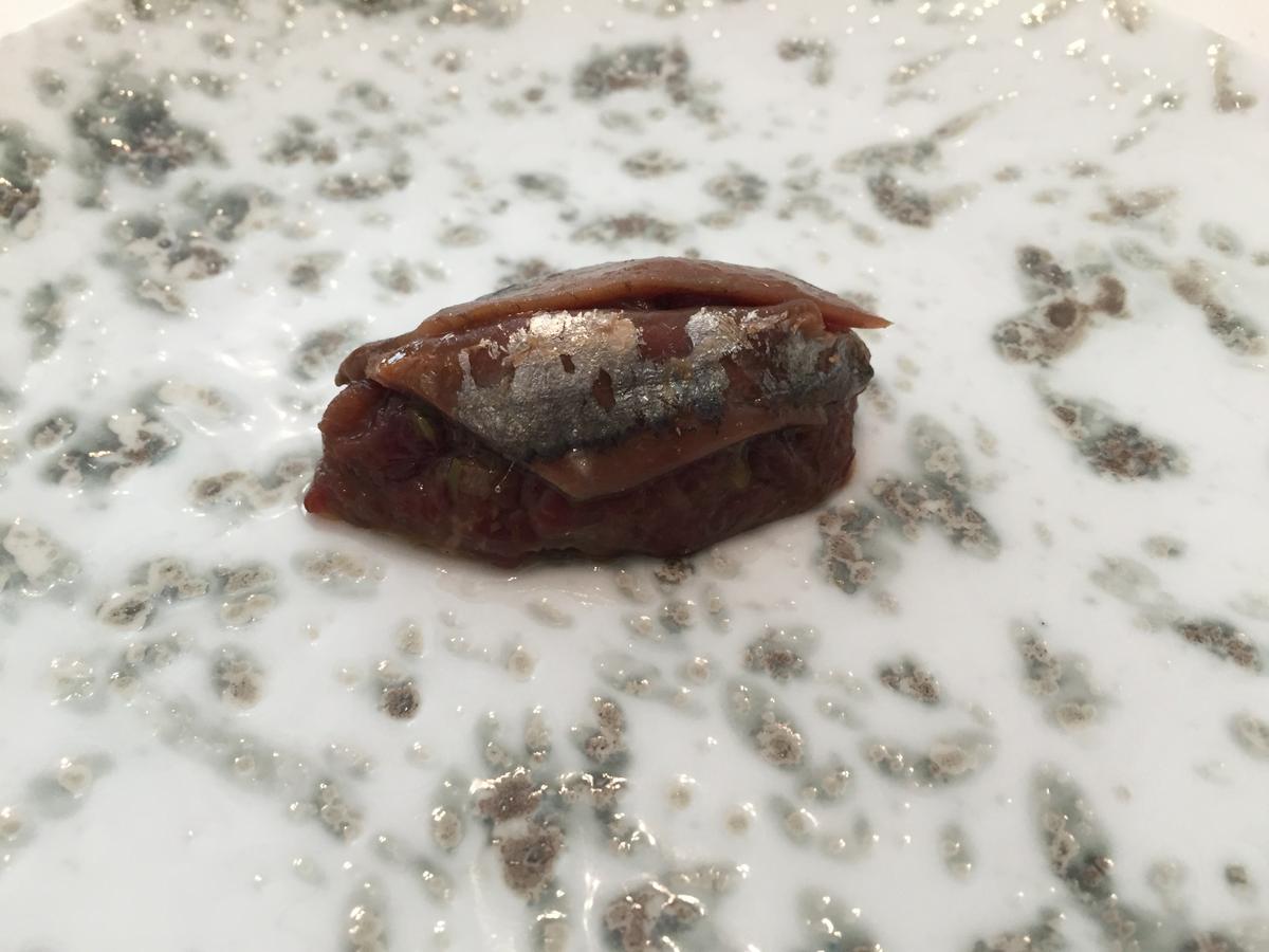 Carne de vaca y anchoa en salazón: una de las pocas concesiones a la carne en un menú en el que predomina más el pescado y, sobre todo, las verduras. Buena textura del steak pero el gusto de la anchoa tapaba en gran parte el de la carne.