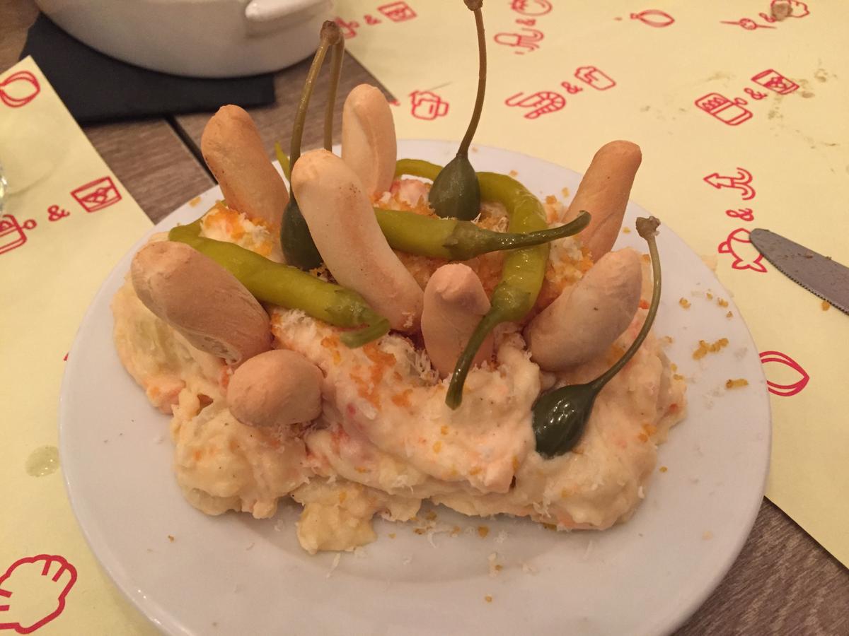 Ensaladilla rusa con botarga ahumada: con los trozos de verdura al punto, pero suficientemente grandes como para que pudiéramos notarlos en la boca. Acompañada de encurtidos y picos: sencilla pero efectiva.