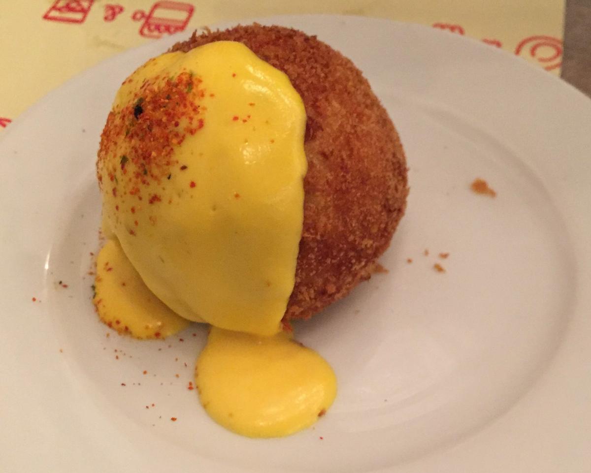 Bomba de cordero y mostaza: una buena ración, con un rebozado crujiente. Muy buena con la salsa, aunque llevaba poca mostaza en el interior.