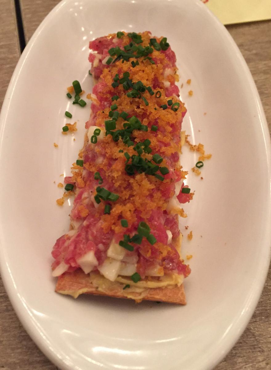 Steak tartar: pedimos papada con anguila, pero ese día no tenían, así que lo cambiamos por este platillo fuera de carta. Viene con botarga y con salsa Café París, por lo que el toque de untuosidad está asegurada. Buen detalle que pregunten el punto de picante al que lo queremos.