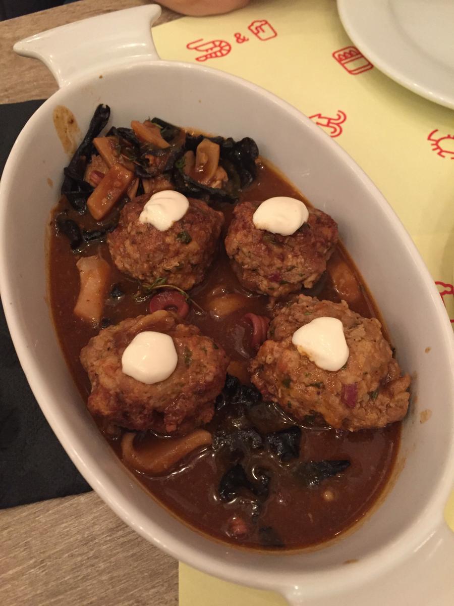 Albondigas de butifarra y calamar con trompetas de la muerte: acabamos con todo un platazo, un mar y montaña en toda regla. Unas albondigas buenísimas, con una textura casi perfecta, combinando la butifarra con el punto justo de calamar, sin matar el sabor de la primera, sino complementándolo.